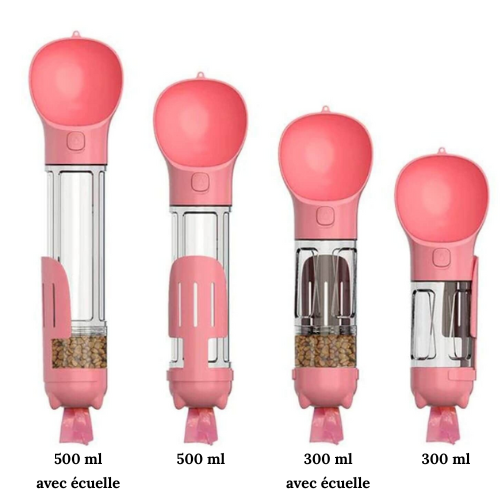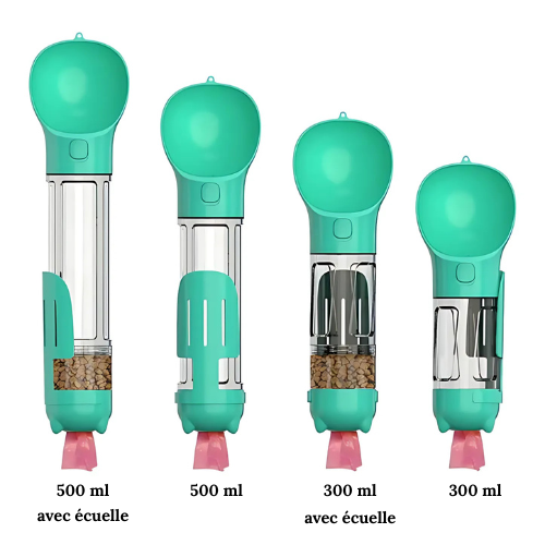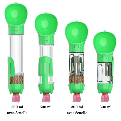 Contrairement aux autres, elle réunit eau, nourriture et hygiène (sacs + pelle) dans un seul accessoire pratique.